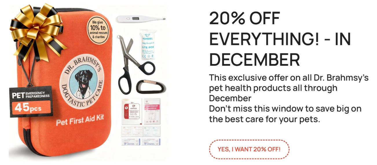 Visit my good friend Brian’s Dr. Brahmsy’s website for his dogstastic pet first-aid kits. They are 20% off during December, and a must-have for those who enjoy the great outdoors with their pets. They make excellent stocking stuffers, too!